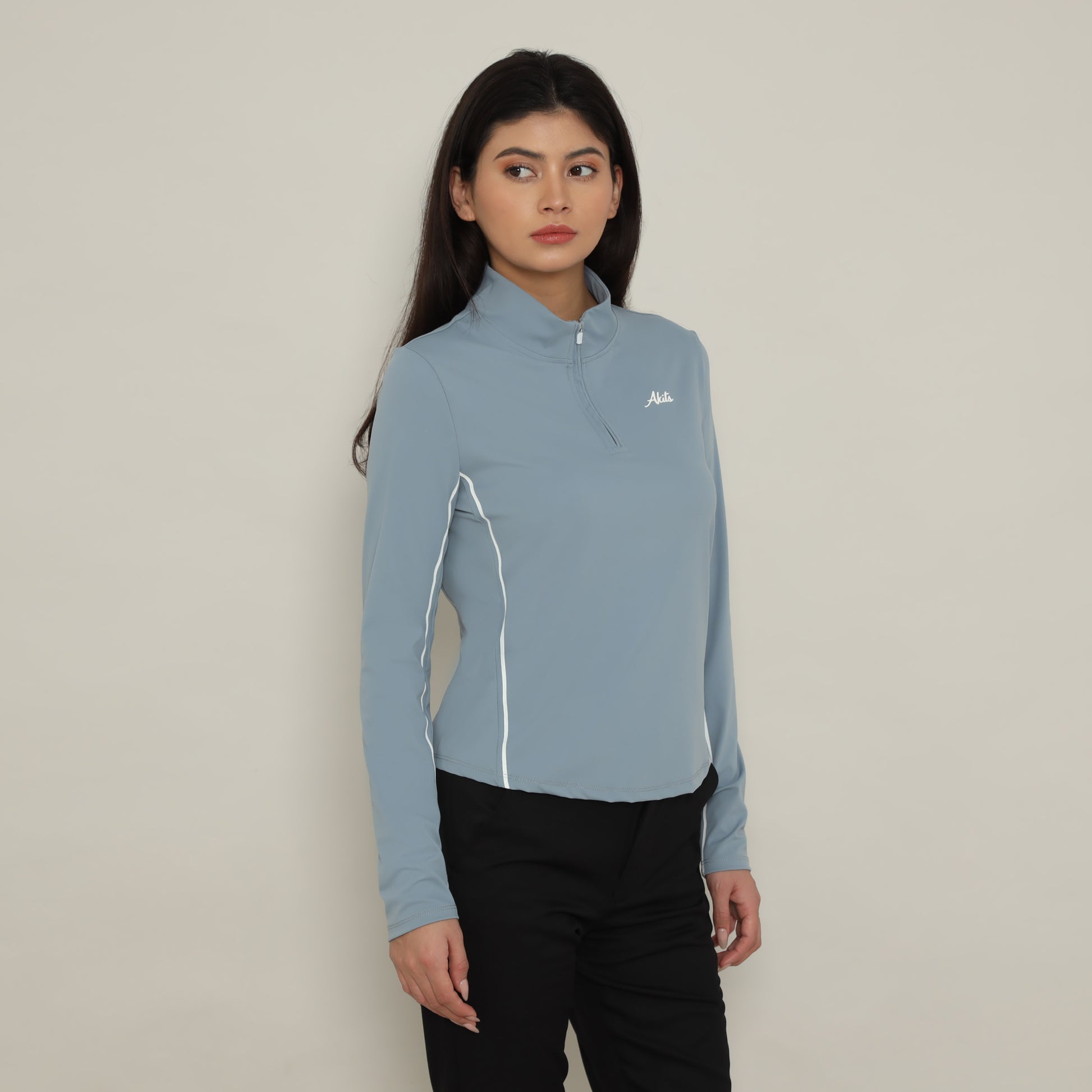 Stay stylish and protected with our Longsleeve Quarterzip. Featuring contrast white-lined accents on the sides and a matching zip. The clean mock-neck with a half-zip closure lets you adapt airflow instantly, while contrast panel lines sculpt and flatter your form. Designed for comfort and functionality, this shirt offers UPF 50+ protection to keep you shielded from harmful rays while you're on the go. Perfect for layering or wearing solo, it's a versatile addition
